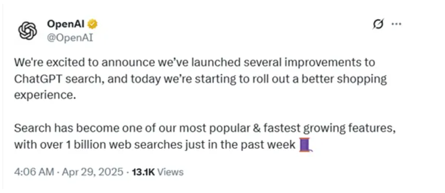 此次更新面向所有Plus、Pro和免费用户开放。ChatGPT搜索已成为OpenAI的核心功能之一,仅上周使用量就突破10亿次。