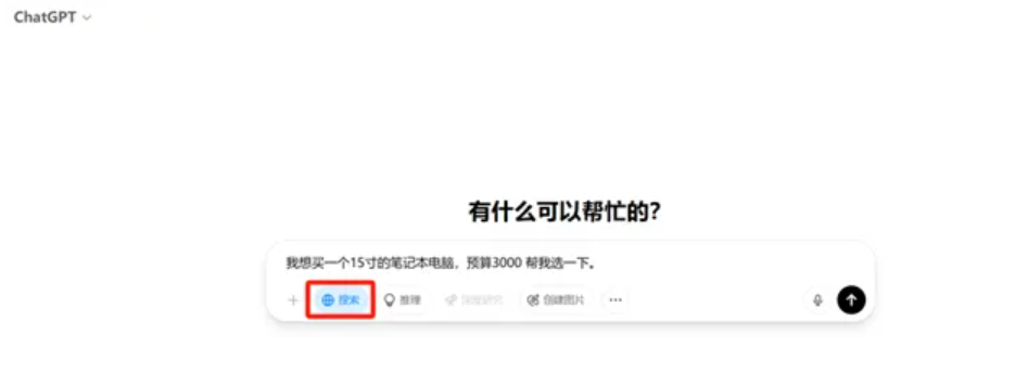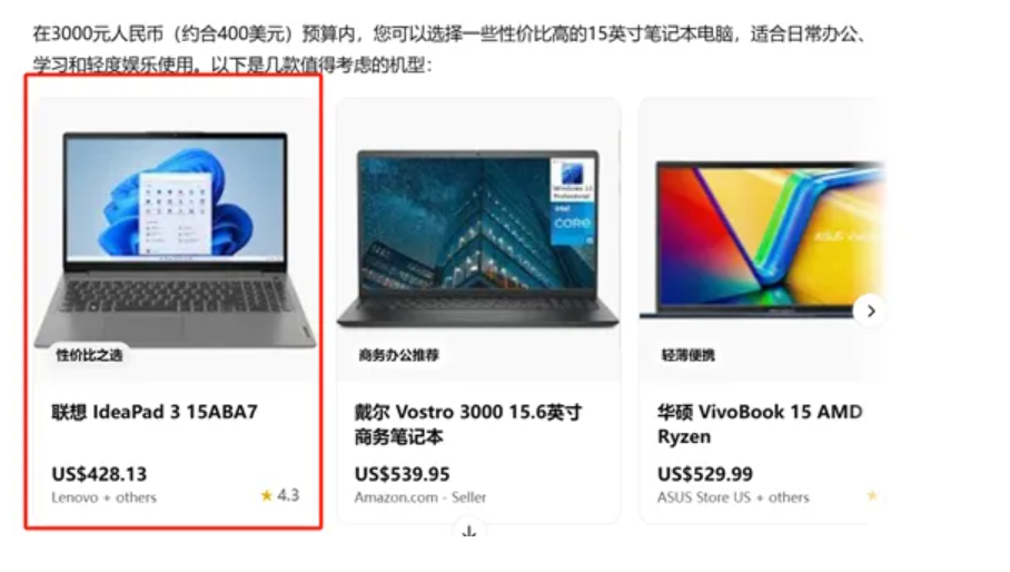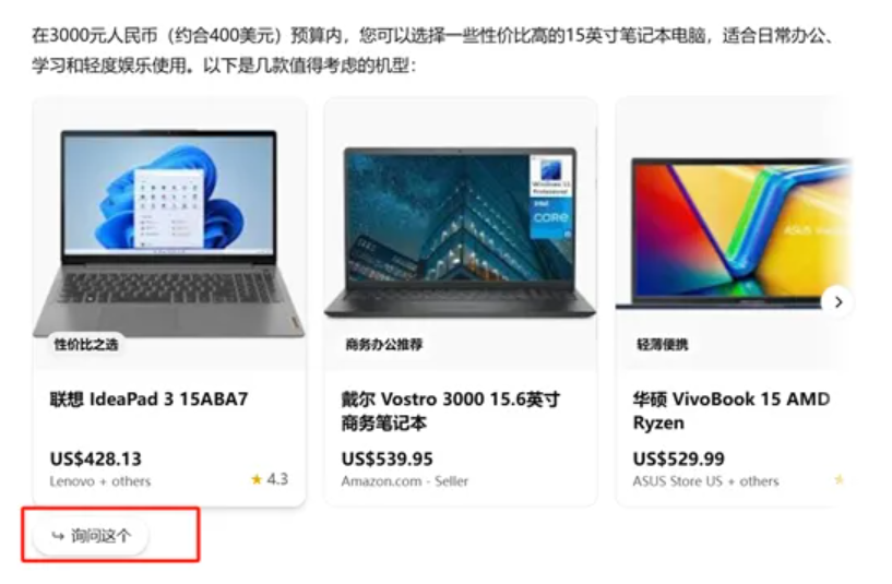 新功能演示:输入“我想买一个15寸的笔记本电脑,预算3000,帮我选一下”,搜索结果直接显示笔记本图片、价格及参数,配备文字说明,购物体验更直观。