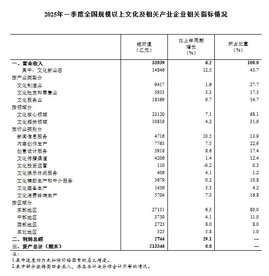 2025年一季度,全国规模以上文化及相关产业企业实现营业收入33939亿元,同比增长6.2%。其中,文化新业态特征明显的行业小类增长12.5%。文化服务业成为拉动增长的重要力量,东部地区持续引领发展。文化企业利润总额同比增长29.1%,盈利能力显著提升。