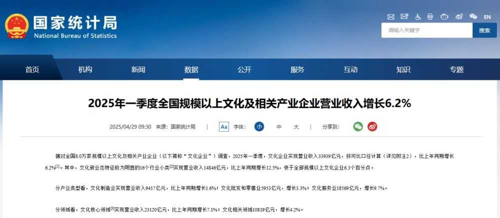 据对全国8.0万家规模以上文化及相关产业企业(以下简称“文化企业”)调查,2025年一季度,文化企业实现营业收入33939亿元,同比增长6.2%。其中,文化新业态特征明显的16个行业小类实现营业收入14846亿元,同比增长12.5%,增速高于全部规模以上文化企业6.3个百分点,显示出文化产业的强劲动力和新兴领域的蓬勃发展。