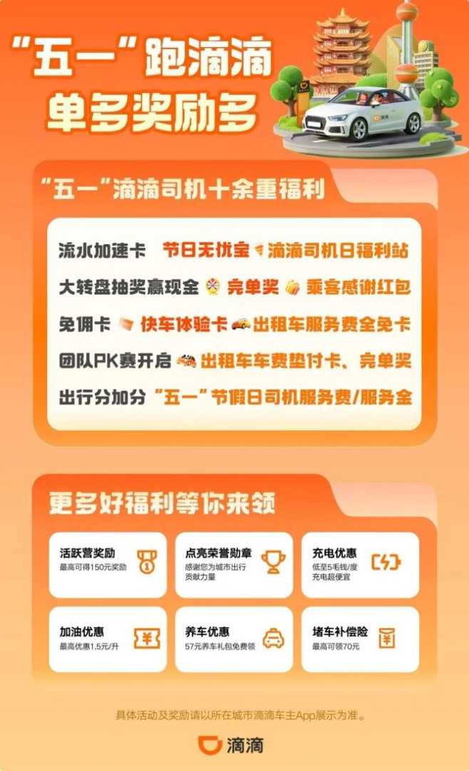 为致敬假期辛勤工作的司机,滴滴将发放超过4亿元补贴,并提供十余项福利。司机可通过滴滴车主App参与购买流水加速卡、免佣卡等活动,增加收入。同时,平台将在部分城市试行上线节假日司机服务费,帮助司机提升接单收入。