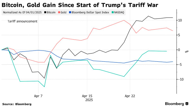 尽管连创历史新高的黄金在4月曾一度无比闪耀,但当人们到了月底回首复盘时,却不难发现一个比其更牛的资产:比特币。数据显示,比特币在本月迄今的涨幅达到了黄金的两倍,这重新引发了关于比特币是否可以作为市场动荡时期(如美国全面关税引发的纷争)的避风港的争论。