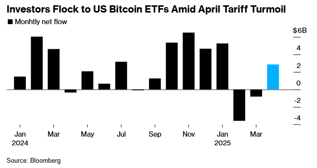 数据显示,4月迄今,投资者向美国上市的比特币现货ETF注入了约29亿美元,较3月和2月分别录得的8.11亿美元及36亿美元的净流出,出现了显著逆转。
