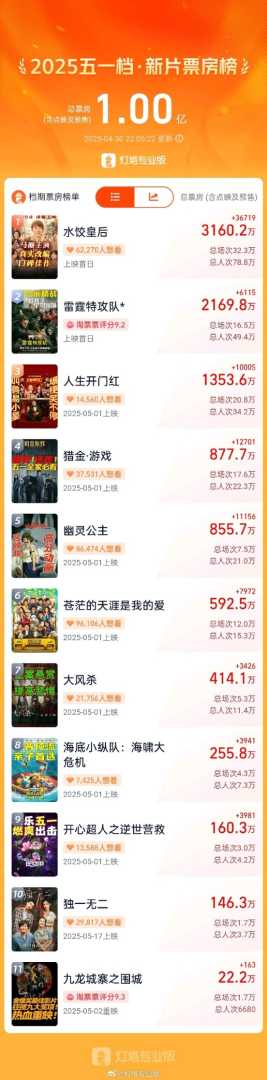 据灯塔专业版数据显示,截至2025年4月30日22时05分,2025年五一档新片(含重映)总票房(含点映及预售)已强势突破1亿元大关。其中,影片《水饺皇后》《雷霆特攻队*》《人生开门红》《猎金·游戏》《幽灵公主》以及《苍茫的天涯是我的爱》以出色的票房成绩暂列票房榜前六位,成为今年五一档的热门影片。这一票房佳绩不仅彰显了观众对电影市场的热情回归,也预示着电影行业正迎来新一轮的繁荣。