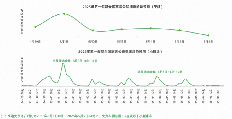 据交通运输部预测,今年假期日均跨区域人员流动量将超2.7亿人次,全国高速公路日均流量约为6200万辆,峰值出现在假期第一天(5月1日),约为平日流量的2.1倍。高德地图联合多地交管部门发布的数据显示,出程拥堵高峰将集中在5月1日9时至12时,峰值时段为10时至11时,整体压力显著高于返程;返程高峰较为分散,预计5月4日15时至18时为拥堵时段,5月6日恢复常态。
