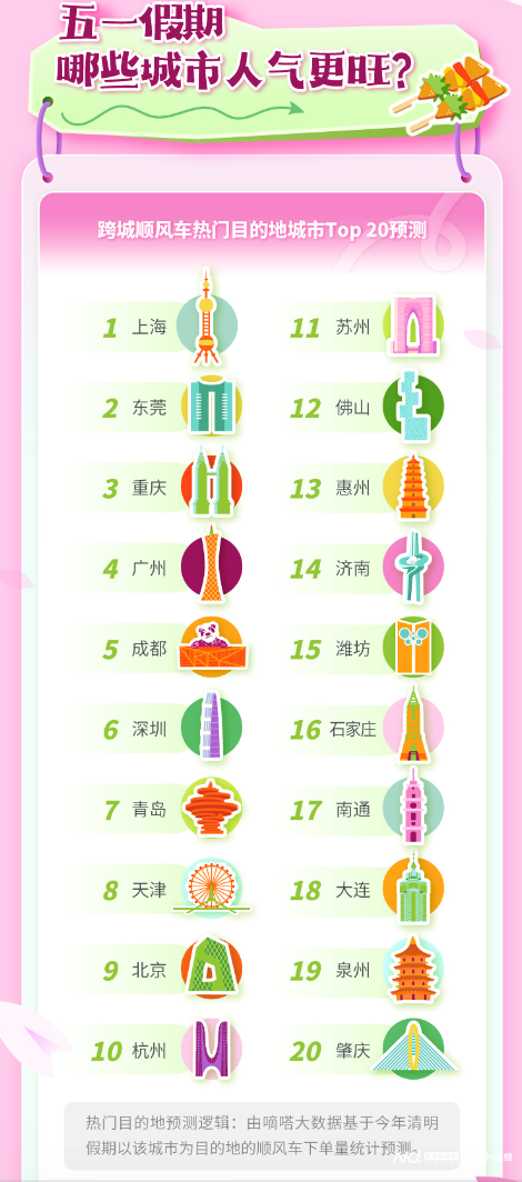 嘀嗒出行数据显示,五一期间,搭乘顺风车前往旅游景点的日均下单量预计较平日增长140%,出发高峰日将出现假期第一天即5月1日,4月30日和5月2日为两个出发次高峰。假期顺风车热门目的地城市Top 10预计将依次是上海、东莞、重庆、广州、成都、深圳、青岛、天津、北京、杭州。Top 20城市主要分布在珠三角、长三角、京津冀、山东及川渝地区。