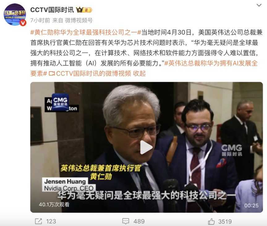 据CCTV国际时讯报道,当地时间4月30日,美国英伟达公司总裁兼首席执行官黄仁勋在谈及华为芯片技术时高度赞扬,称“华为无疑是全球顶尖科技公司之一,在计算、网络及软件领域实力惊人,具备推动AI发展的全面能力。”