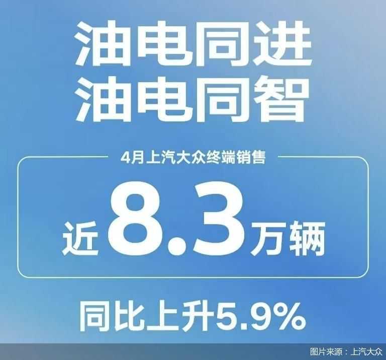 上汽大众发布最新销售数据,4月终端销量接近8.3万辆,同比增长5.9%,显示出强劲的市场复苏迹象,反映了消费者需求的回升及市场竞争中的稳固地位。