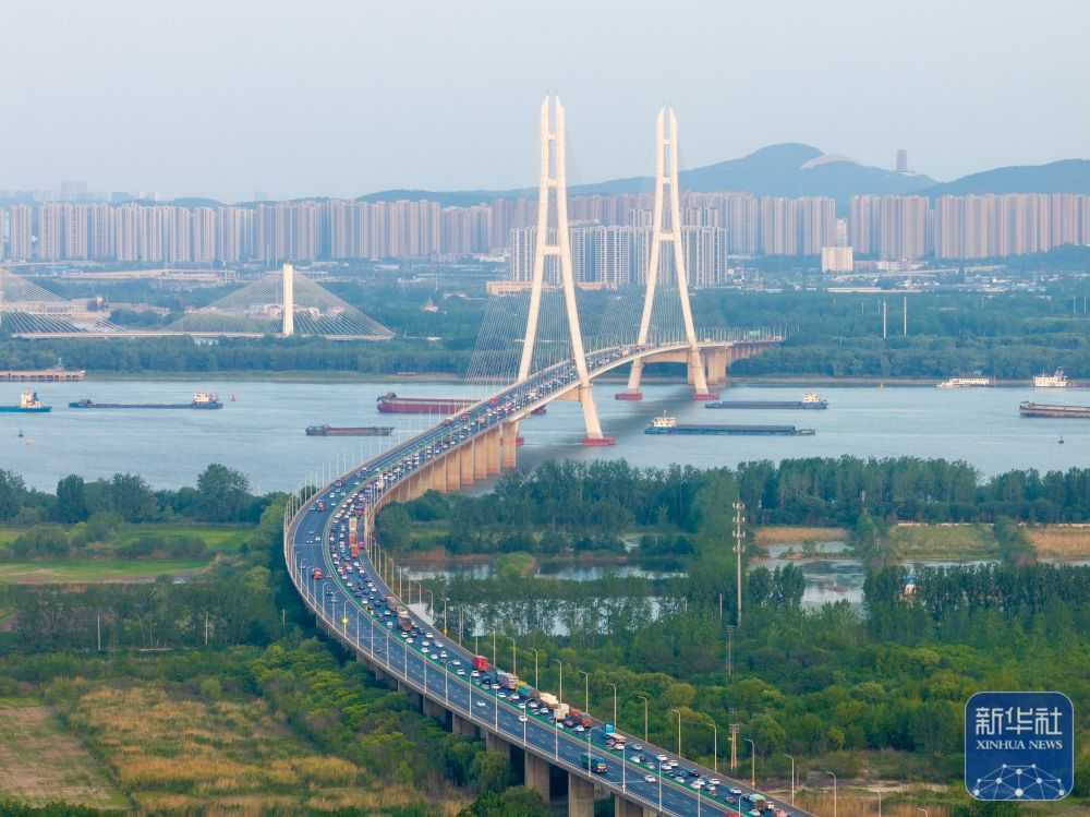 ↑ 南京大胜关长江大桥上车流如织,反映了假期的繁忙景象(无人机照片)。新华社发(杜懿摄)