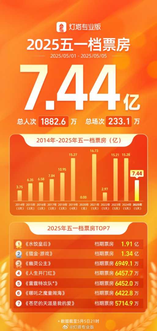 2025年五一档电影票房累计达7.44亿元,其中《水饺皇后》领跑,累计票房2.13亿元。《哪吒2》档期票房超6422万元,全球票房已逼近《泰坦尼克号》。今年五一档影片类型丰富,满足多层次观众需求。