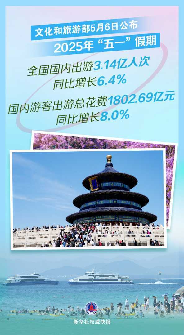 文化和旅游部5月6日公布2025年“五一”假期文化和旅游市场情况。经文化和旅游部数据中心测算,假期5天,全国国内出游3.14亿人次,同比增长6.4%;国内游客出游总花费1802.69亿元,同比增长8.0%。这一数据体现了国内旅游市场的强劲复苏和消费升级趋势。