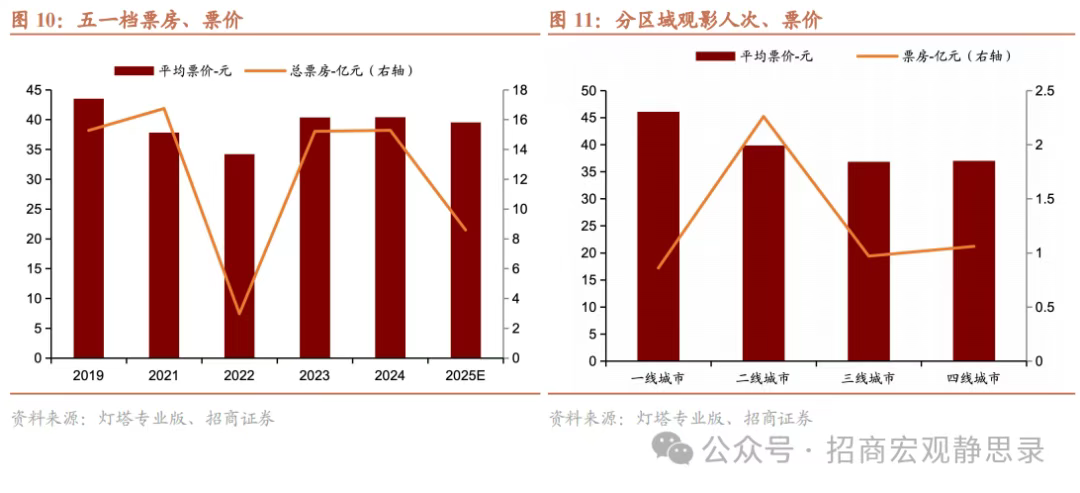 电影市场:量价齐跌,一线城市电影消费低迷,二线城市领跑。五一档电影市场票房合计仅为5.15亿,平均单日票房1.72亿,较去年大幅下滑。二线城市票房占比最高,一线城市票房最低。