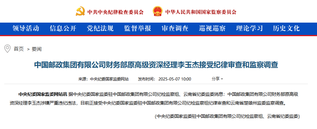 5月7日,中央纪委国家监委网站发布消息,据中央纪委国家监委驻中国邮政集团有限公司纪检监察组、云南省纪委监委消息,中国邮政集团有限公司财务部原高级资深经理李玉杰涉嫌严重违纪违法,目前正接受中央纪委国家监委驻中国邮政集团有限公司纪检监察组纪律审查和云南省楚雄州监委监察调查。这一消息再次凸显了反腐斗争的严峻性和复杂性。
