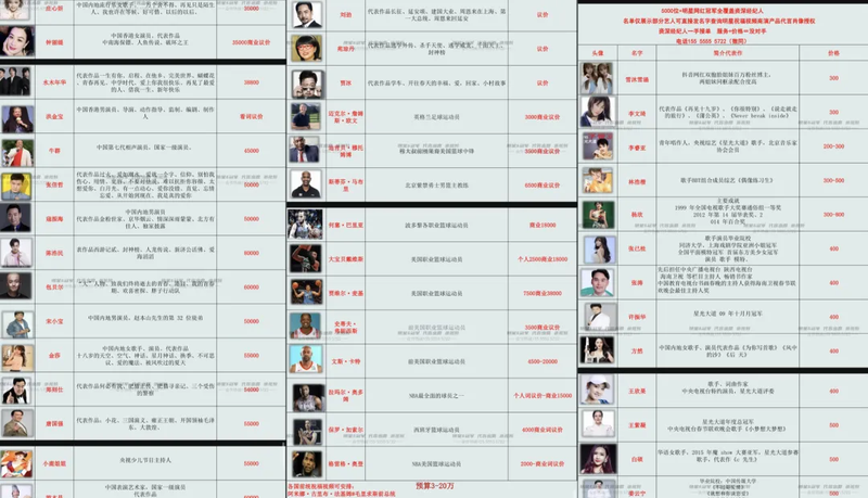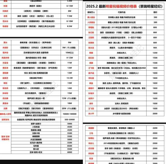例如,一些知名度低的明星报价最低800元,有一定知名度的普遍在千元左右;知名度较高的报价则在万元以上,如沈腾20万。此外,还能请到墨西哥前总统、苹果联合创始人等国际名人,单人报价1.88万元。