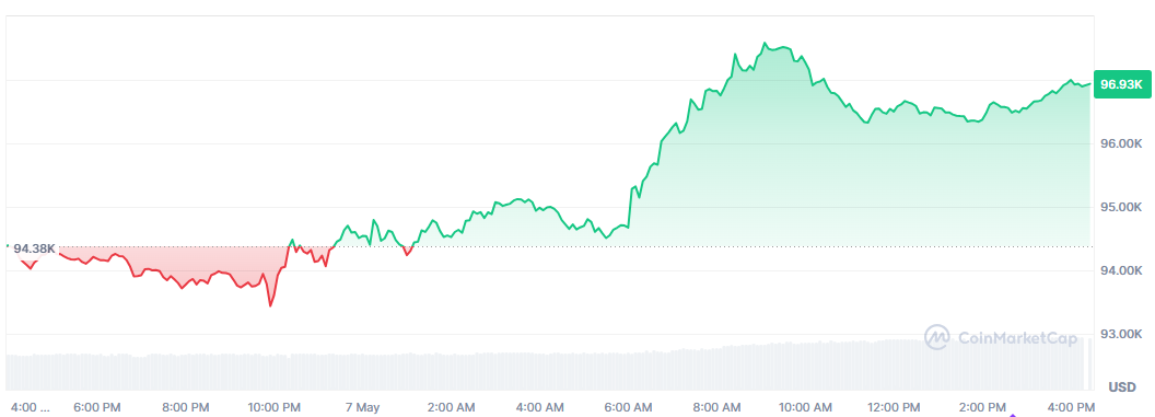 财联社5月7日讯受到中美贸易谈判乐观情绪推动,比特币价格在周三迎来上涨,涨幅超过3%。此前,受比特币现货ETF资金流入影响,该代币一个月内上涨约25%。