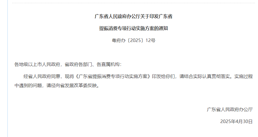 广东省人民政府网站5月7日消息,日前,广东省人民政府办公厅印发《广东省提振消费专项行动实施方案》。