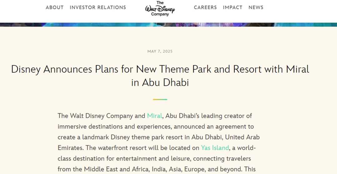 迪士尼宣布将与中东开发商Miral合作,在阿联酋阿布扎比开设中东首家迪士尼主题乐园。消息发布后,迪士尼股价暴涨逾10%。新乐园将落户亚斯岛,预计设计需一两年,建造需四至六年。