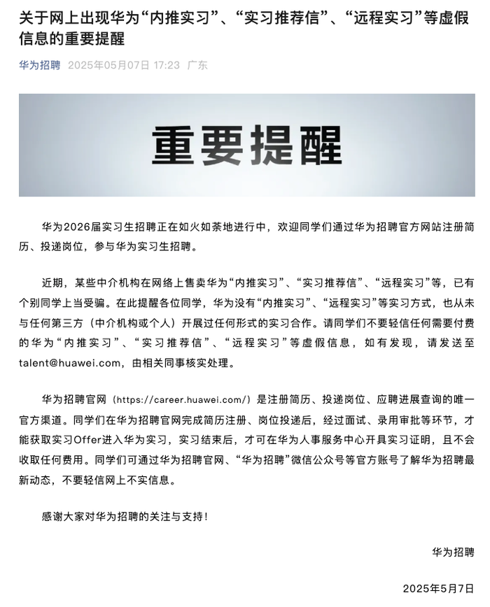 华为招聘微信公众号发布声明,指出近期有中介机构售卖华为“内推实习”等服务,并已有学生受骗。华为明确表示从未与任何第三方进行实习合作,提醒求职者提高警惕。