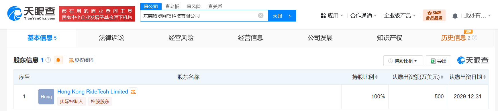 近日,东莞哈罗网络科技有限公司成立,注册资本500万美元,经营范围广泛。该公司由哈啰出行旗下HongKongRideTechLimited全资持股,此举将进一步拓展哈啰出行的业务范围。