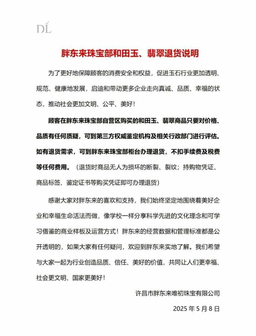 据胖东来官方账号消息,5月8日,胖东来官方正式发布了和田玉、翡翠的退货政策说明。这一举措再次彰显了胖东来对消费者权益的高度重视。
