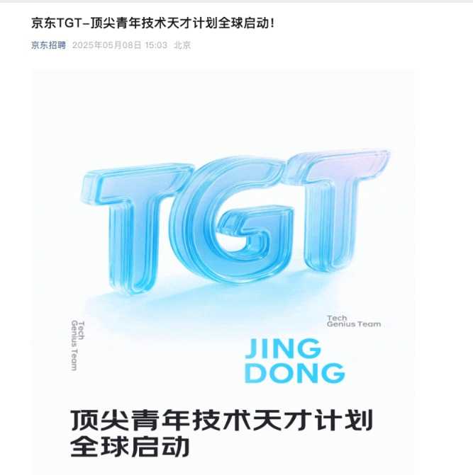 5月8日,“京东招聘”微信公众号发布消息,宣布“京东TGT—顶尖青年技术天才计划”全球启动,旨在吸引全球技术人才,探索前沿技术,创造更多美好。