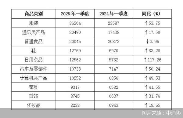 5月8日,中国消费者协会(以下简称“中消协”)发布了《2025年第一季度全国消协组织受理投诉情况分析》(以下简称《受理投诉情况分析》)。数据显示,今年一季度,全国消协组织共受理消费者投诉超过46万件,同比增长33.33%。在商品大类投诉中,家用电子电器类、服装鞋帽类、日用商品类、食品类、交通工具类投诉量位居前五位。而具体到商品投诉,日用杂品、鞋、服装、汽车及零部件的投诉量均有同比增长。