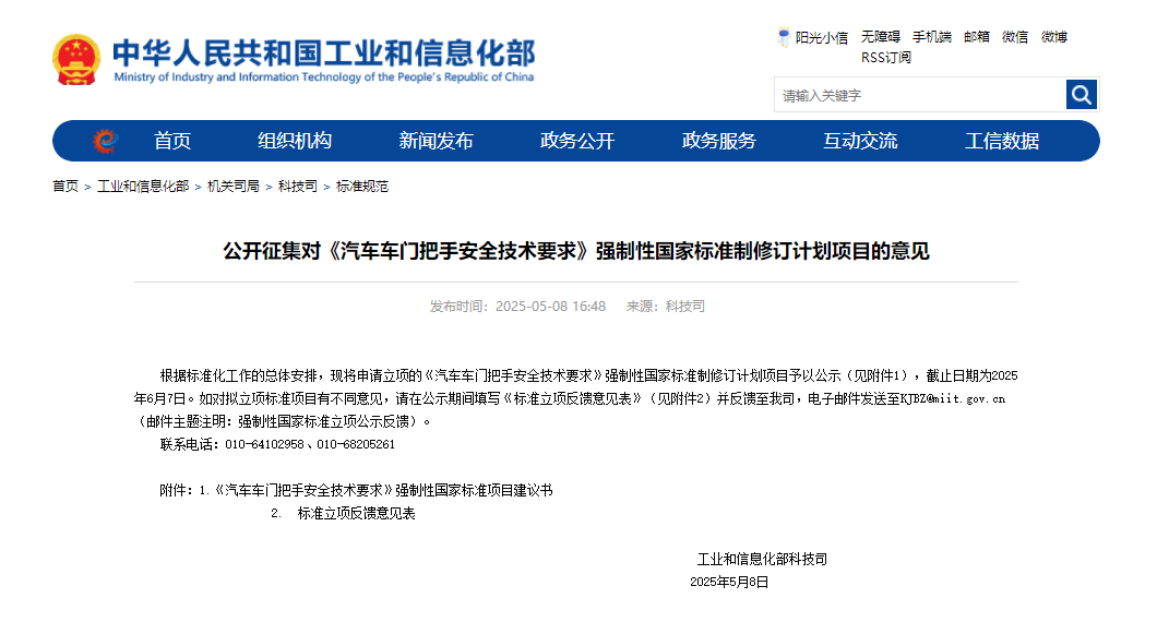 工信部表示,根据标准化工作的总体安排,现将申请立项的《汽车车门把手安全技术要求》强制性国家标准制修订计划项目予以公示,截止日期为2025年6月7日。这一举措将强化车门把手的安全性能。