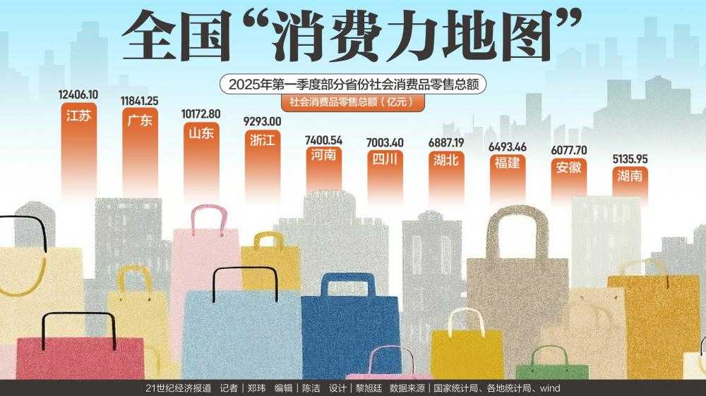 2025年一季度,江苏、广东、山东三省社会消费品零售总额分别为12406.10亿元、11841.25亿元和10172.80亿元,位居前三。