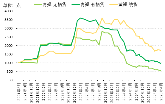 中药材市场整体呈现周期性波动,但平顺潞党参展现出强劲的价格韧性。大条、中条、小条三个规格的产品价格指数自2021年基期以来,虽经历市场波动,却始终保持上升趋势,凸显了平顺潞党参的独特市场地位和品质优势。