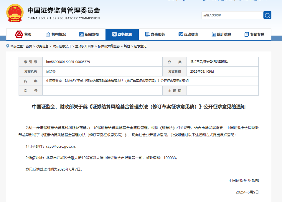 5月9日,证监会会同财政部起草形成《证券结算风险基金管理办法(修订草案征求意见稿)》,涉及适应性调整计收范围,下调计收比例,完善风险基金规模等六方面内容。修订对于进一步完善风险基金管理制度,适应证券市场发展和结算风险防控需要具有重要意义。