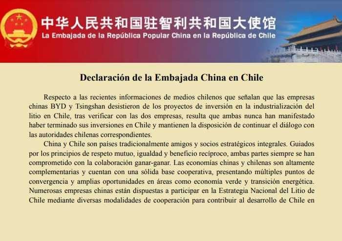中国驻智利大使馆发布声明称,比亚迪和青山控股从未声明终止在智利锂电产业化投资项目,愿同智利有关部门继续对话。中智两国在绿色经济、能源转型等领域存在广阔机遇,使馆将继续鼓励和支持中企在智利投资。