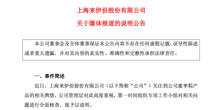 来伊份回应蜜枣粽异物事件,全面下架相关产品
