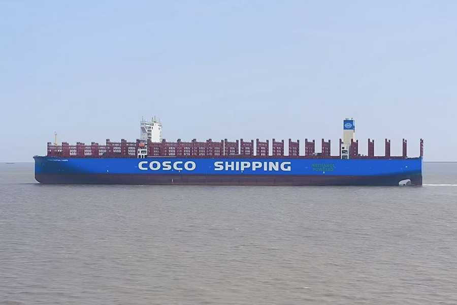 作为国内首艘采用甲醇双燃料动力的超大型集装箱船,“中远海运洋浦”轮总长366米、型宽51米,最大载箱量达16136标箱。其绿色甲醇燃料通过先进的合成技术生产,碳排放几乎为零,颗粒物排放大幅降低,完全符合国际海事组织2030年航运减排目标,兼具环保与经济优势。由于甲醇的特殊性,加注采用了“车-船”联运模式,历经5天完成全部燃料运输及加注。