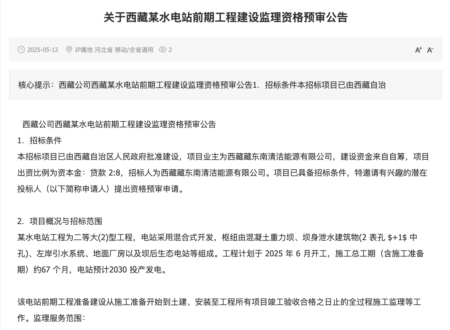 中国电力招标采购网发布西藏某水电站前期工程建设监理资格预审公告,项目由西藏藏东南清洁能源有限公司负责,资金自筹与贷款比例为2:8,预计2025年6月开工,2030年投产发电,将促进西藏清洁能源开发。