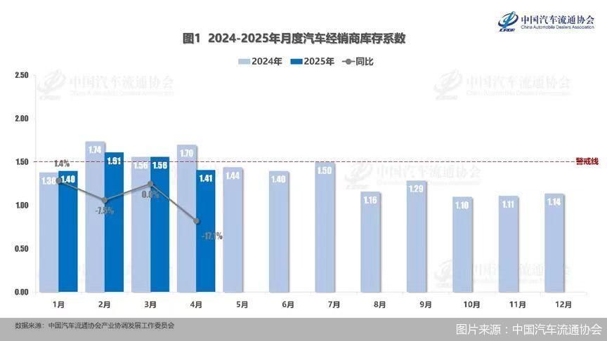 中国汽车流通协会发布“汽车经销商库存”调查结果,4月汽车经销商综合库存系数为1.41,环比下降9.6%,同比下降17.1%,显示出库存压力有所缓解,可能对市场供需及销售策略产生影响。