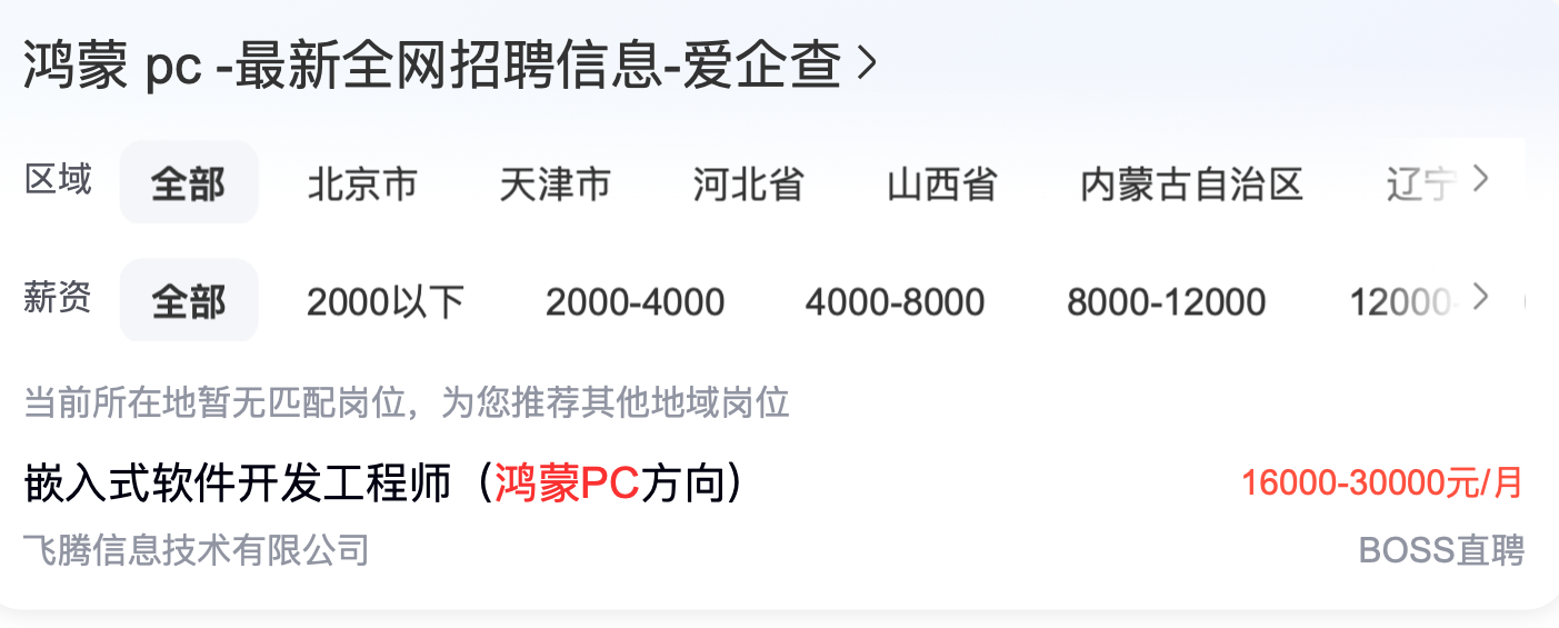 鸿蒙生态的扩张离不开开发人才的支持。根据InfoQ研究中心发布的《中国开发者画像洞察研究报告2024》,鸿蒙生态面临百万级人才缺口,潜在新就业岗位超过300万个。部分企业正在招聘鸿蒙PC方向的嵌入式软件开发工程师,月薪在1.6万元至3万元不等。