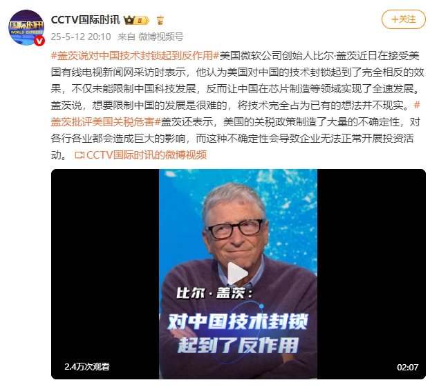 据CCTV国际时讯报道,美国微软公司创始人比尔·盖茨近日在接受美国有线电视新闻网采访时,针对美国对中国的技术封锁发表了看法。盖茨认为,美国的技术封锁措施并未达到限制中国科技发展的目的,反而促进了中国在芯片制造等领域的快速发展。
