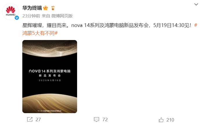 据华为终端微博消息,nova14系列及鸿蒙电脑新品发布会将于5月19日14:30举行。