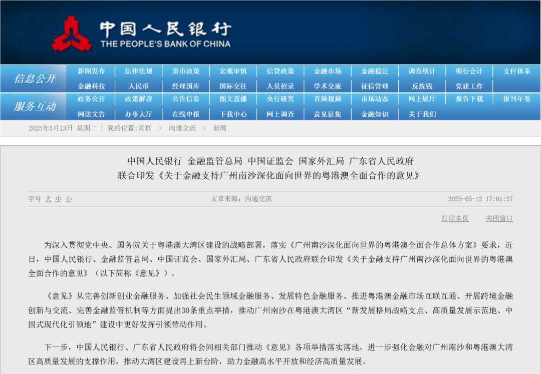 5月12日,中国人民银行等五部门联合印发《关于金融支持广州南沙深化面向世界的粤港澳全面合作的意见》(下称“南沙金融30条”),旨在强化南沙对粤港澳大湾区高质量发展的支撑作用,将其打造成为我国金融业对外开放试验示范窗口。