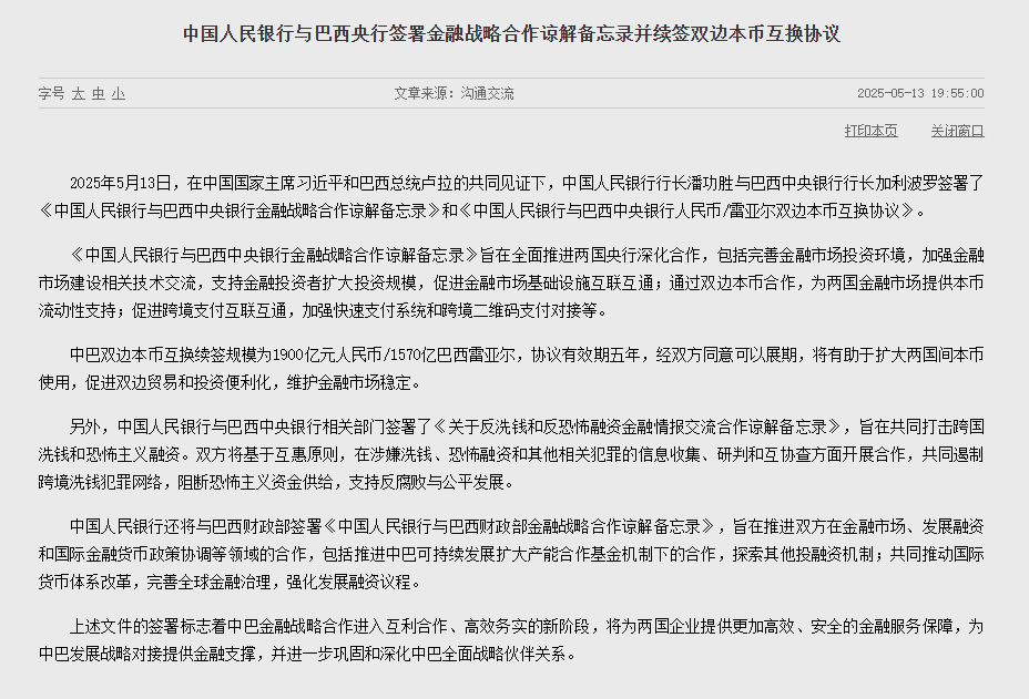 中国人民银行网站消息,5月13日,中国人民银行与巴西中央银行正式签署了《中国人民银行与巴西中央银行金融战略合作谅解备忘录》和《中国人民银行与巴西中央银行人民币/雷亚尔双边本币互换协议》。