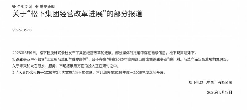 据最新消息,5月13日,松下电器在官网发布声明,5月9日松下控股株式会社发布集团经营改革进展后,部分媒体报道中存在错误信息。松下声明如下:课题事业中不包含“工业用马达和车载零部件”,且不存在“2025年度内退出或出售课题事业”的计划。马达产品业务发展前景良好,未来将加大在研发、服务、市场拓展等方面的投入。同时,“人员优化将于2029年3月内实施”为不实信息,本计划将在2025年度至2026年度之间开展。