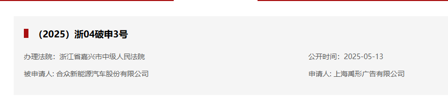 5月14日,证券时报·e公司记者从全国企业破产重整案件信息网获悉,哪吒汽车母公司合众新能源汽车股份有限公司新增一则破产审查案件,申请人为上海禹形广告有限公司,经办法院为浙江省嘉兴市中级人民法院。该信息于5月13日公开。
