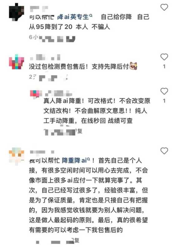 “降AI”成为“黑箱实验”。学生纷纷做起“降手”,在社交媒体接单,提供“纯人工降”、“先降后付”等服务。由于多为在校学生兼职,收费较低。