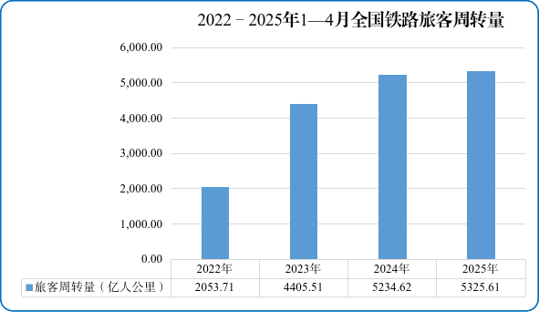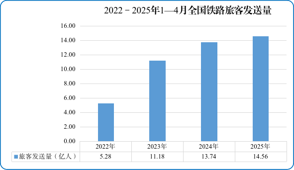 图1展示了2022—2025年1—4月全国铁路旅客发送量的增长趋势。