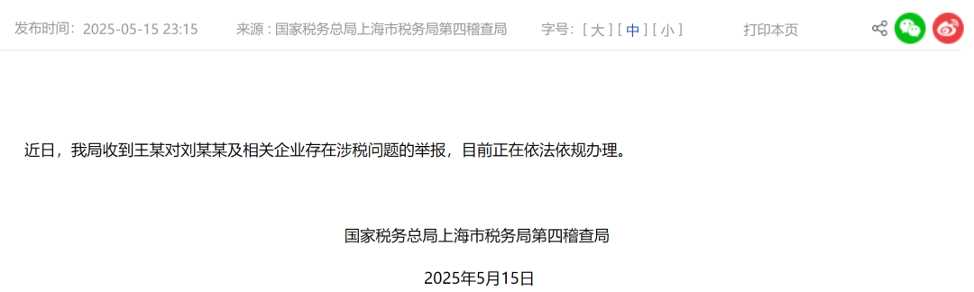 5月15日晚,国家税务总局上海市税务局第四稽查局发布通报称,已收到王某对知名演员刘晓庆及相关企业存在涉税问题的举报,并正在依法依规处理中。这一事件引发了广泛关注。