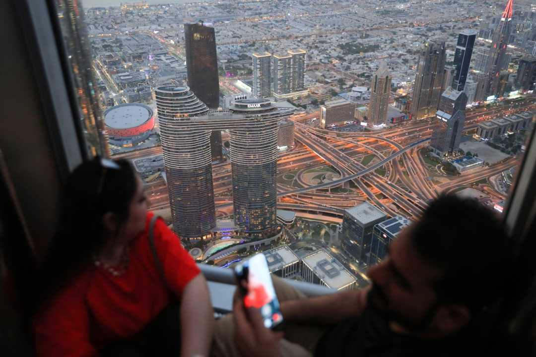 2024年8月31日,人们在阿联酋迪拜的哈利法塔上观赏城市景观。新华社记者隋先凯摄
