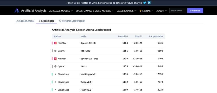 近日,上海的AI独角兽MiniMax稀宇极智发布了新一代语音大模型Speech-02。这款模型在国际权威的语音评测榜单Artificial Analysis和Hugging Face TTS Arena上,成功击败OpenAI、ElevenLabs等国际巨头,夺得双榜第一。