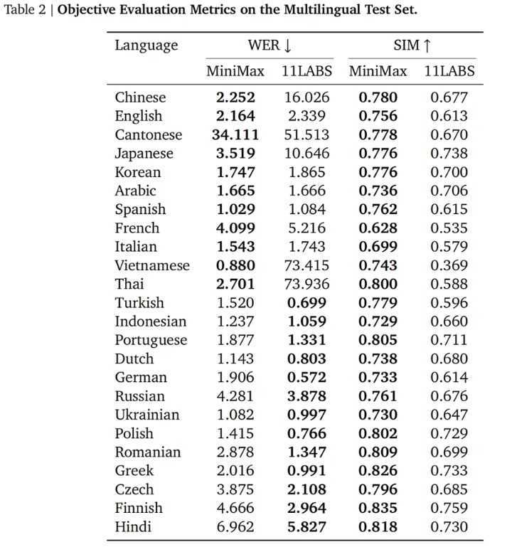 Speech-02在语音模型核心技术指标:字错率WER和相似度SIM上,取得了SOTA(State-of-the-Art,当前最好)结果,用户盲听主观评价反馈也更自然、真实。具体来看,与Seed-TTS、CosyVoice 2和真实音频相比,Speech-02在中英文的零样本语音克隆中均实现了更低的WER,表明其发音错误率更低且更清晰稳定。在SIM方面,Speech-02在所有24种测试语言中均显著优于ElevenLabs的multilingual_v2模型,生成的语音更接近真人。