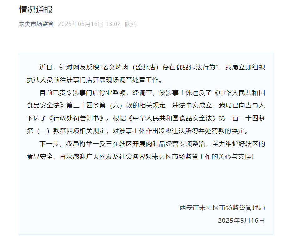 5月16日,西安市未央区市场监督管理局针对此事发布官方通报: