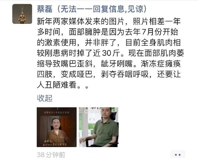 今年2月5日,蔡磊在社交平台分享近况,晒出两张照片,透露自己因激素使用导致面部臃肿,全身肌肉掉近30斤。他感慨渐冻症剥夺了他的健康与美丽。